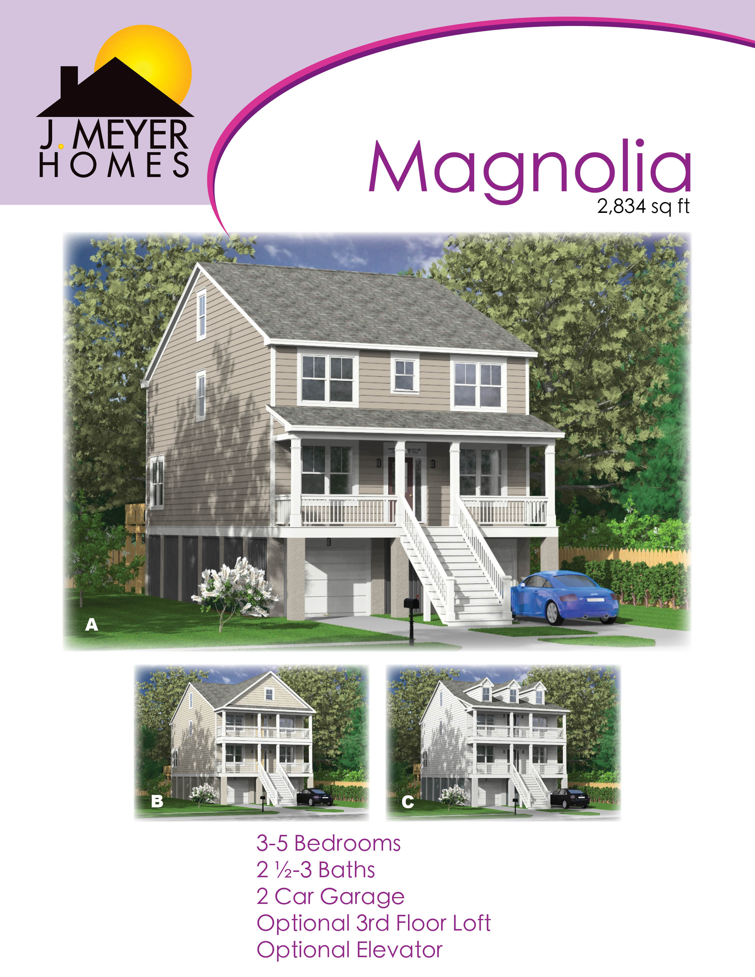 The Magnolia is 2,834 square feet, two story, three to five bedroom and two 1/2 to three bath home. The Magnolia has a two car garage, optional third floor loft and optional elevator.