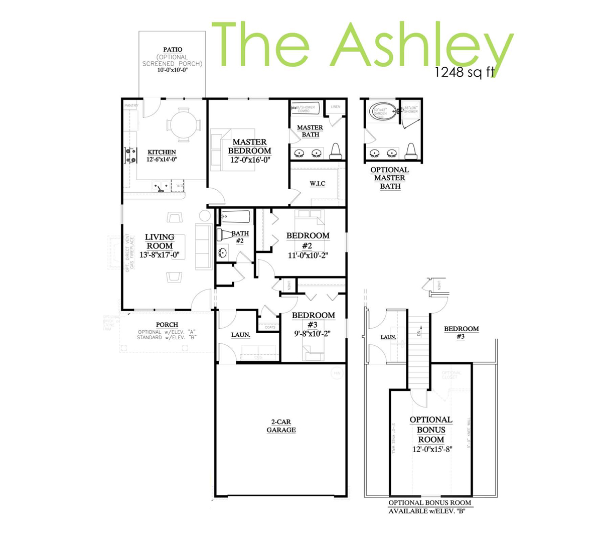 The Ashley is 1,248 square feet, single story, three bedrooms and two bath home. The Ashley has 4 options exterior styles you can choose from, plus an optional bonus room over the garage.