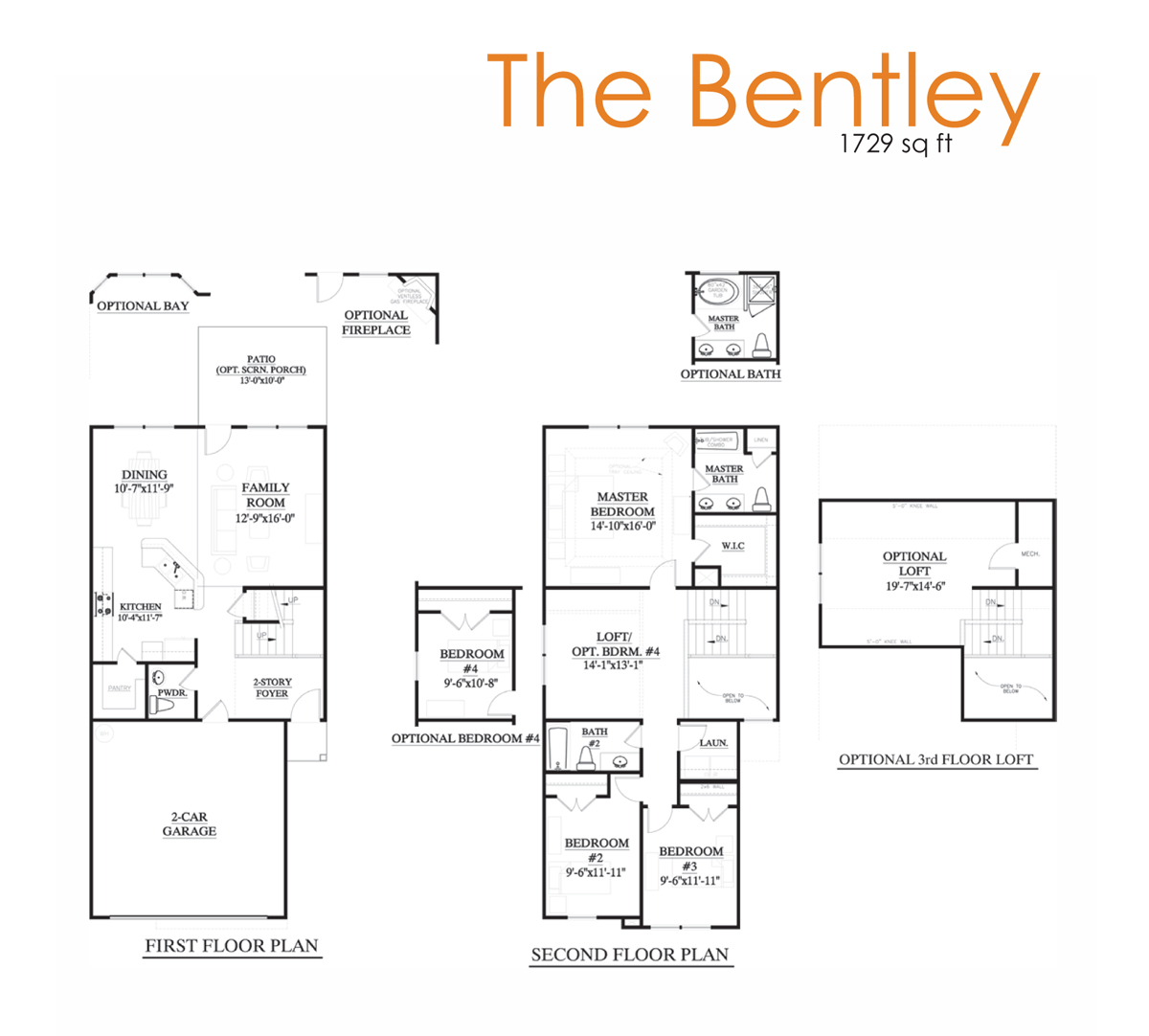 The Bentley is 1,729 square feet, two story, three bedrooms and two and half bath home. The Bentley has 4 options exterior styles you can choose from, plus an optional fourth bedroom, and optional third floor with loft.