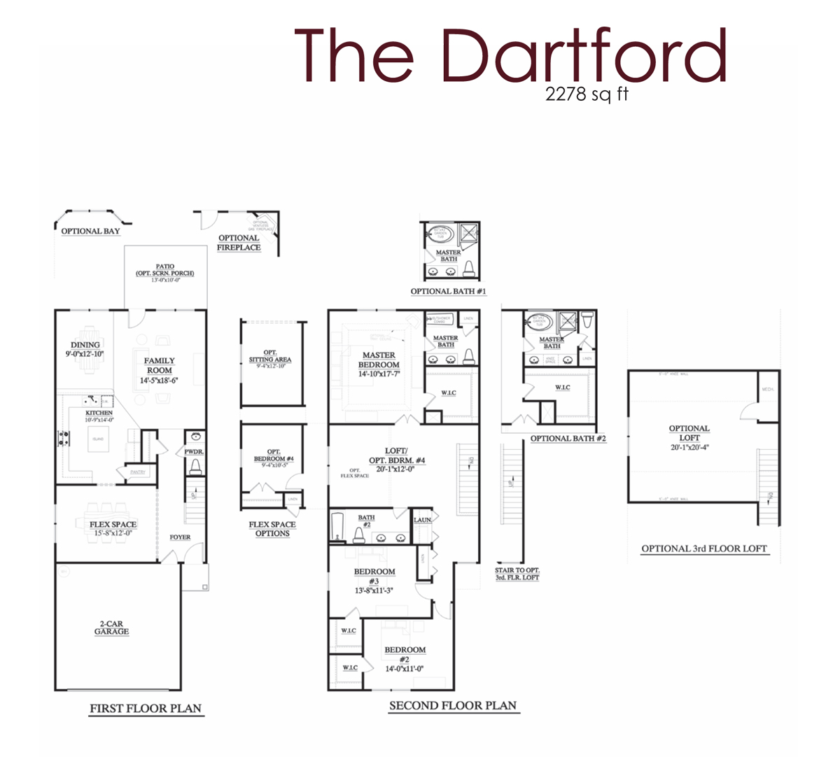 The Dartford is 2,278 square feet, two story, three bedrooms and two and half bath home. The Dartford has 4 options exterior styles you can choose from, plus an optional third floor loft, first & second floor master bedrooms, and option fourth bedroom.