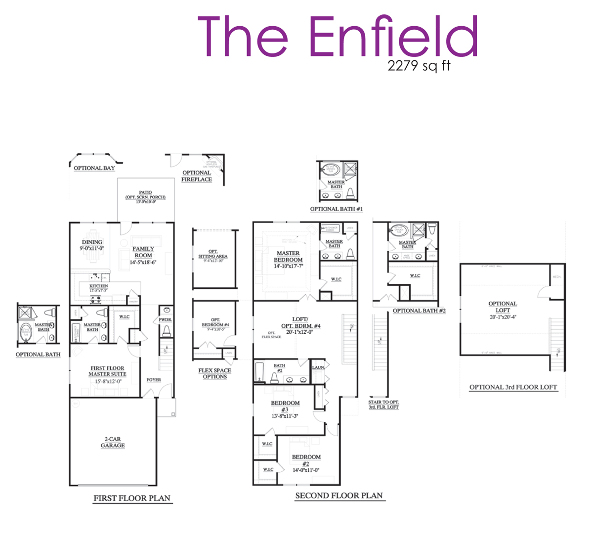 The Enfield is 2,279 square feet, two story, three bedrooms and three and half bath home. The Enfield has 4 options exterior styles you can choose from, plus an optional third floor loft, first & second floor master bedrooms, and option fourth bedroom.
